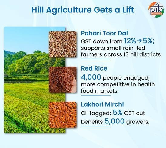 • पहाड़ी तूर दाल, लाल चावल और लखौरी मिर्च पर जीएसटी घटाकर 5% करने से पहाड़ी उत्पादों को बढ़ावा मिला है, जिससे 13 पहाड़ी जिलों के छोटे किसानों को मदद मिली है।